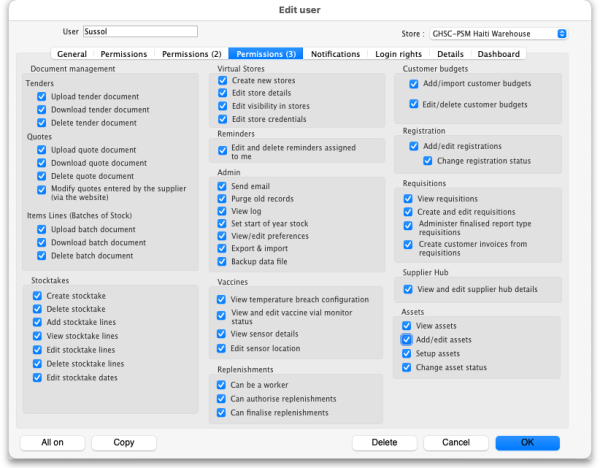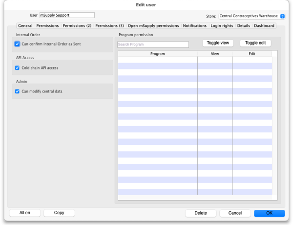 | Can modify central data | If checked then the user can edit settings that are counted as central data in Open mSupply e.g. demographics indicators. |