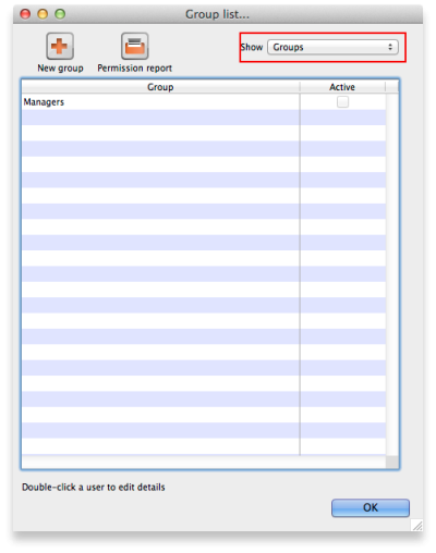 To view groups rather than users, choose Groups from the Show Drop-down list at the top-right of the window. The list changes slightly to look like this: