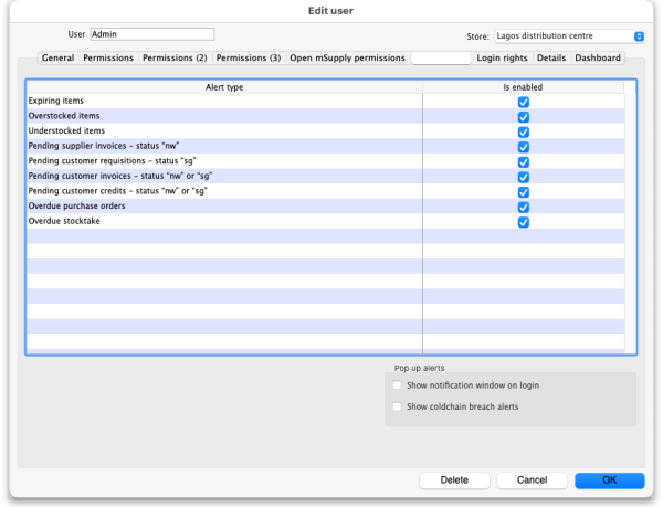 Show cold chain breach alerts: If this is checked the user will see temperature breach alerts (in the store in the Store drop down list above the table - this is a per store permission) passed to mSupply by the cold chain app (see https://docs.msupply.foundation/coldchain/introduction/ for details). If this is not checked then a user will not see temperature breach alerts that occur in this store. Please note that a user must have login rights to a store to be able to see breach alerts, whether this permission is turned on or not.