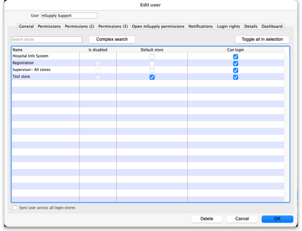 - Normally, when these configuration settings are altered on the Legacy mSupply Central server after a store has been migrated, the settings do not get synced to the remote site. It is now possible to sync user permission settings across all stores that they have permission to log in to, regardless of which site the store is on (on the Edit user > Login rights tab). As mSupply is currently configured, this setting defaults to ‘off’, and needs to be turned on every time a user is edited.