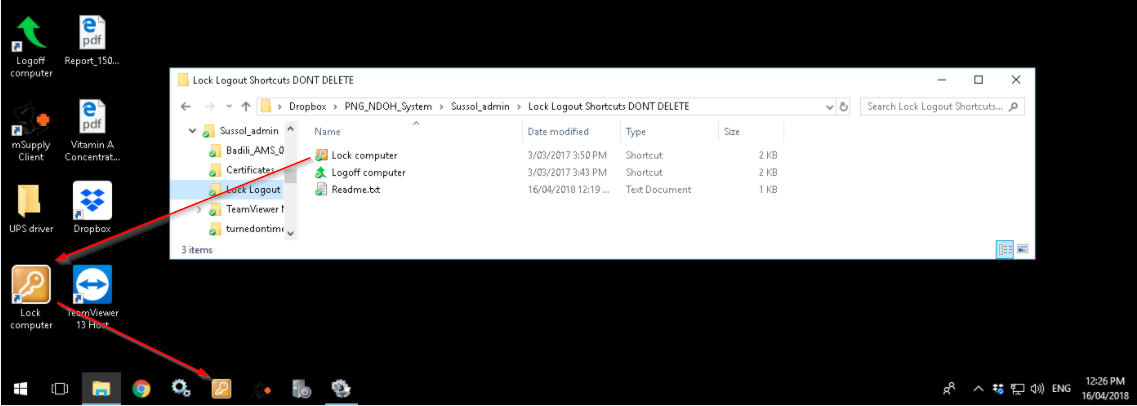 It is too easy for support workers accessing the server remotely to accidentally shutdown the server. Therefore, two Windows shortcuts have been created to allow support workers to easily logoff or lock their windows session without having to go through the usual Windows procedure: