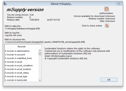 Choosing this item displays information about the version of mSupply in use, and provides details of the location and size of your data file.