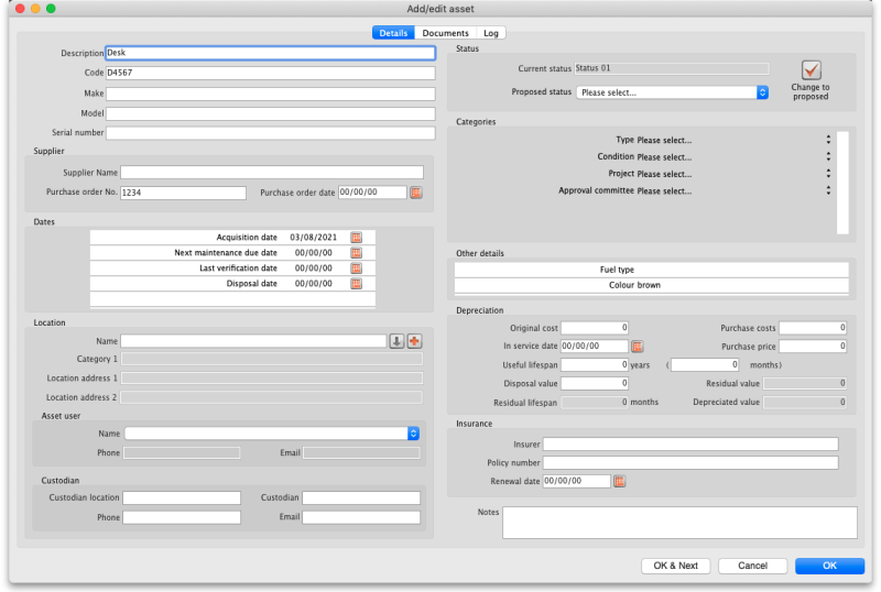 Custodian: The asset custodian would typically be someone in authority who is responsible for the asset or someone who is temporarily looking after it. These fields are all text fields and you can enter the details as required.
