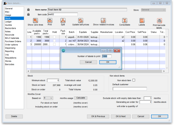 You can click on a single line before clicking on the Print barcode labels button, in which case mSupply offers to print a label for each pack in the selected line. You can edit the number to something else if you wish: