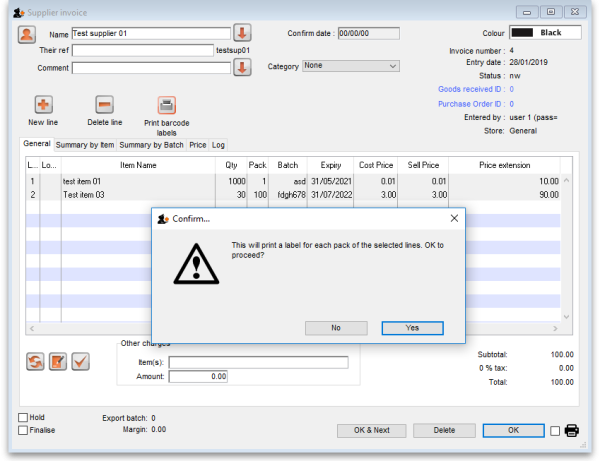 If you select multiple lines on the supplier invoice before clicking on the Print barcode labels button, mSupply will print a label for each pack in the lines selected. This could be a lot of labels so mSupply asks you to confirm before telling the label printer to print them all: