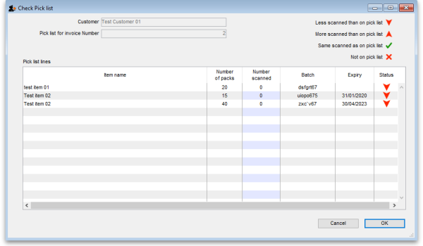 When you have finished scanning all the picked items, a simple look at the Status column will tell you if the pick matches the pick list. If every row has a
