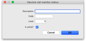 You can access the vaccine vial monitor (VVM) status configuration window by choosing Item > Vaccines > Show vaccine vial monitor status… from the menus. This will open the VVM status window: