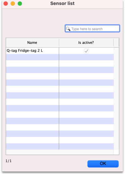 To get started, the first thing you need to do is to plug your Berlinger sensor into the USB port of the computer mSupply is running on. Now choose Item > Vaccines > Sensors from the menus and the Sensor list window will open. You will probably also see a progress window telling you how far through the process of reading the information on the Fridge Tag mSupply has got. When the progress bar has finished, a sensor will appear in the list like this: