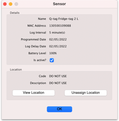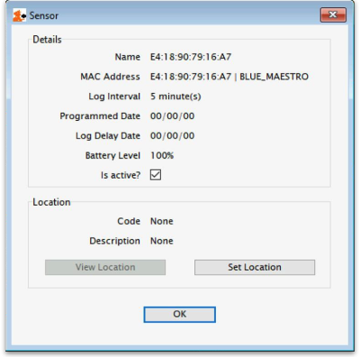 The next step is to assign a shelf location to the sensor so that mSupply knows which stock is associated with the temperature information provided by the Fridge Tag. To do this, double-click on the sensor in the list and the sensor detail window will open: