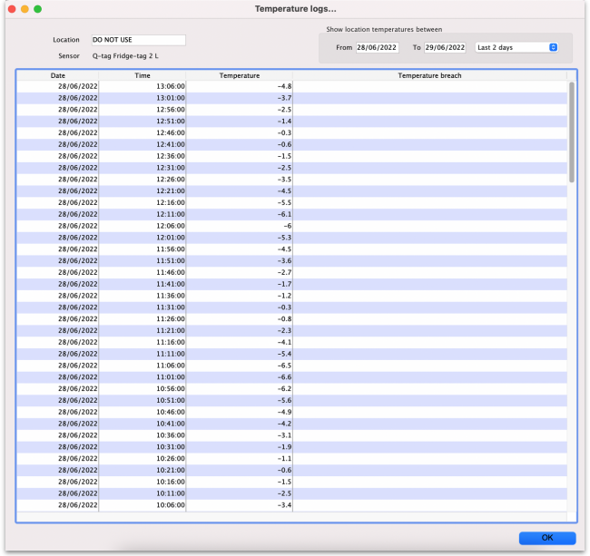 To view the temperature information that has been downloaded from Fridge Tag sensors, choose Item > Vaccines > Temperature logs from the menus. This will show you a list of locations assigned to sensors. Double-click on the location you want to see the temperature logs for and the temperature logs window will open: