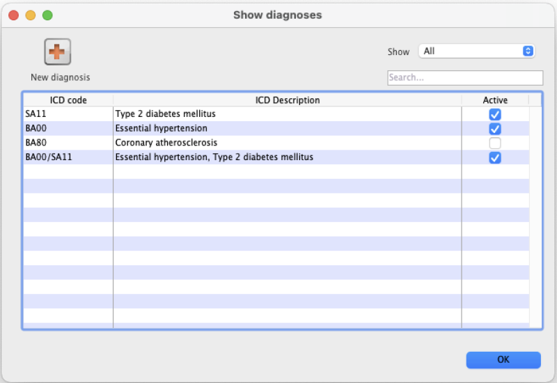 - Inactive: diagnoses that have passed their specified valid till date. Inactive diagnoses will not appear in other windows, and cannot be saved to a patient prescription.