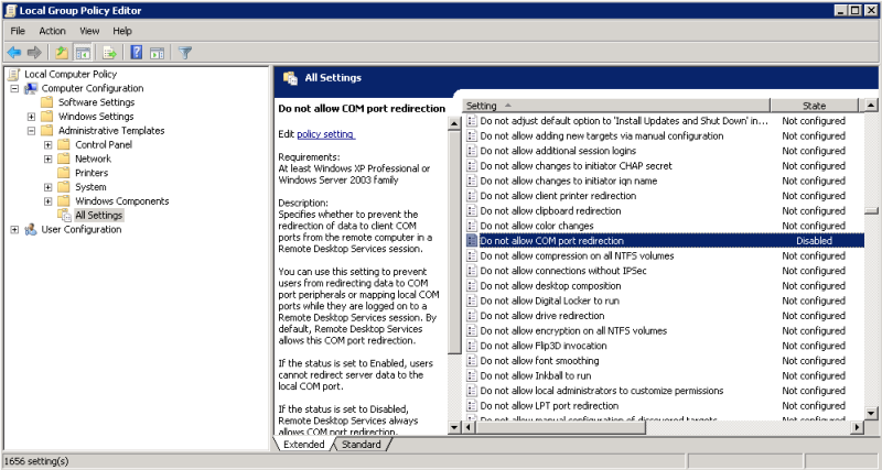 - In the gpedit window, follow the hierarchy shown below and make sure “Do not allow COM port redirection” is disabled (not configured probably fine).