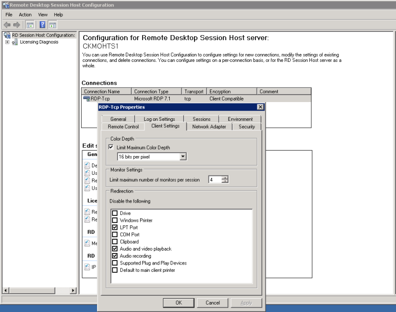 - In the tsconfig window, right click on “RDP-Tcp” and click “properties”. Go to client settings and make sure that the COM port is unchecked in “Redirection - disable the following” list.