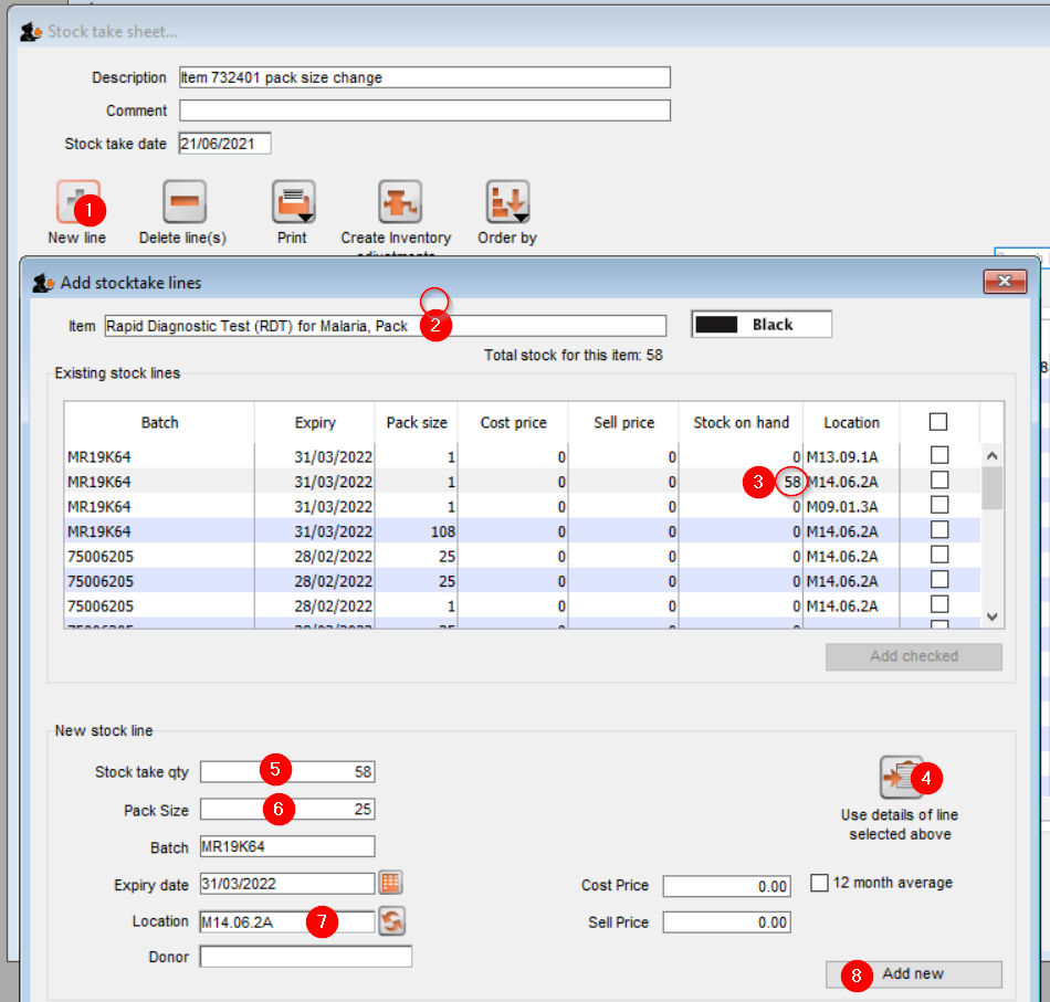 - Select the line of the existing stock line (see that the Stock on hand = 58)