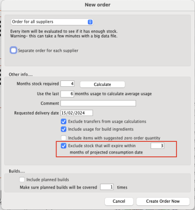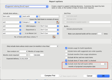 The Suggested ordering report now has a new/updated expiry filter checkbox : Exclude stock that will expire within 3 months of projected consumption date