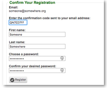 This will send an email with a code to your selected email address. Enter this code and your name and password into the next screen and click the “Register” button.