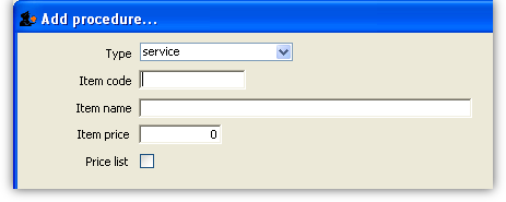 The type of a procedure is fixed as “service”. As for items, once a procedure has been added, there are extra fields and tabs available. However, only a subset of the normal item fields are available.