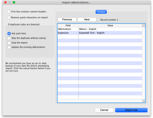 Importing abbreviations is a great way of quickly entering a large number of abbreviations for use in dispensary mode (see the Abbreviations section for details).