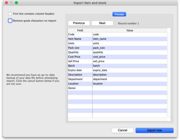 • First line contains column headers checkbox: Check this by clicking on it if the first line of your file contains the column headers. If this checkbox is checked, mSupply will ignore the first row of the import file and only import from the second row onwards.