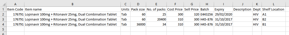Here is a blank spreadsheet with the right columns you can use: msupply_stock_import.xlsx Note: the first row of data in red is an example row - delete it before you import it!