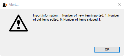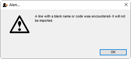 • Number of items skipped: This should be =1 if you did not edit out the last <CR><LF> in the import file. If it is >1, then some lines of the import file have a blank name or code, which is likely a problem and needs to be investigated.