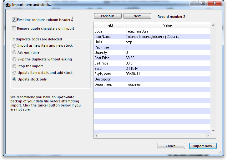 4. Clicking on the Previous and Next buttons allows you to step through the import file so as to review what will be imported, and particularly that the fields have matched up correctly.