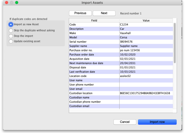 - Update the existing asset: the asset that already exists with the code in the database will be updated with the information contained in the spreadsheet row. A new asset will not be created. BE CAREFUL WITH THIS OPTION: if a cell is blank in the spreadsheet then the corresponding value is removed from the asset (if it had a value set for it), not left as it is.