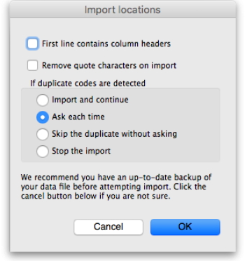 - Stop the import: mSupply will stop importing from the file if it detects a duplicate. Any locations already imported will be kept but no further lines in the file will be processed.