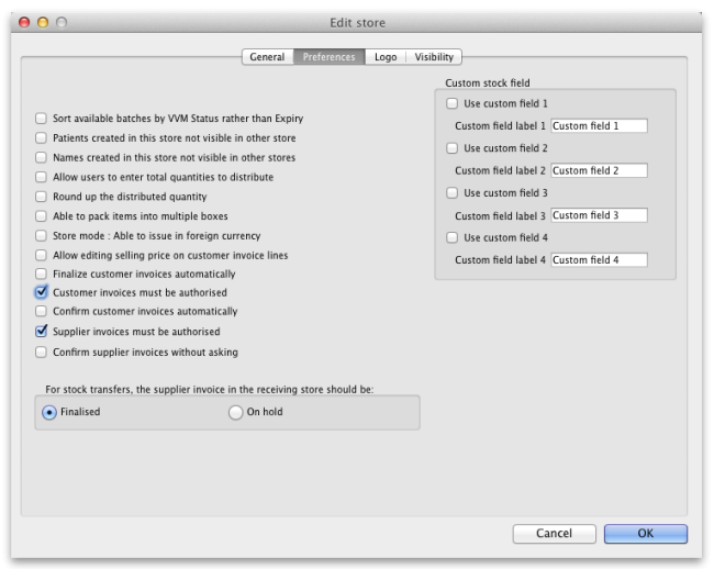 - Set Store preferences to allow for authorisation of invoices. Click drop down menu Special> Store.. click tab Preferences and check boxes Customer invoices must be authorised and Supplier invoices must be authorised. Click OK to return to the Navigator.