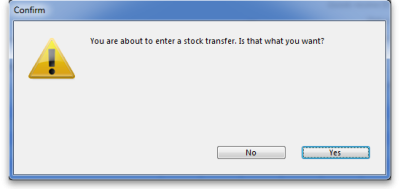 You must be logged in to the issuing store (the store you're transferring stock from); the 'customer' in this process is the receiving store. So, you create a new invoice from the Customer menu, and in the Name field the you put the name of the receiving store in the normal way (i.e. type the first few letters of the store's name, press the TAB key, and select the store in red colored text from the list displayed). You are presented with a window in which you must confirm your intention: