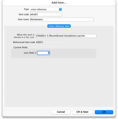 Note: Item custom field 5 is also settable, as shown in the screenshot. It is a number field. This is the user_field_5 for the cross reference item (brand/familiar name), not the normal item. The user_field_5 label shown in the screenshot will be replaced with the name assigned to the field in the preferences (see the 16.01. General preferences page for details) if it has been set. Making this field settable here might seem strange but it is used in some customisations!