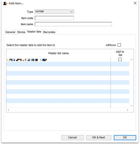 To add the new item to a master list simply check the Add to list checkbox against the particular master list in the table. Note that any master lists that have the Automatically add new items to this master list option checked will have their Add to list checkbox checked and you will not be able to uncheck it.