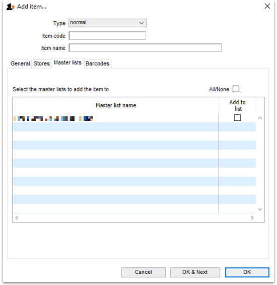 Note: cross reference items cannot be added to master lists so there is no Master lists tab. Their visibility cannot therefore be controlled by master lists but only by directly selecting the stores they are visible in on this stores tab.