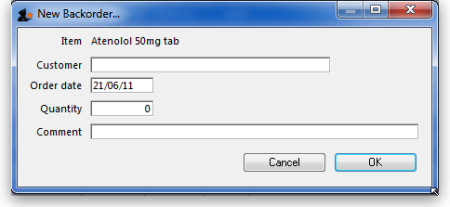 To add a new backorder for this item, click the New backorder button. The same window will be shown but it will be empty, waiting for entry of the details: