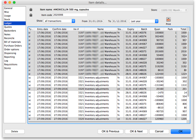 • Transactions for one particular item line. This will show the supplier invoice on which the item line was received, and all subsequent issues of that item line to customers.