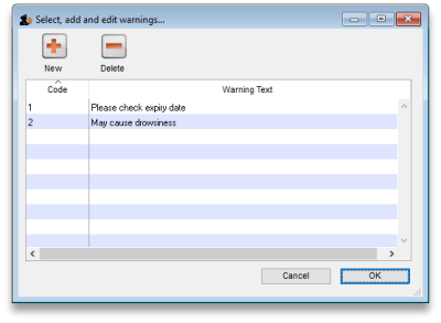 Use the Add button to add a warning for the item. This will open the below window where you can choose the warning from a list. Double click on the warning you want to use. You may also add new warnings to the list by clicking the new button.