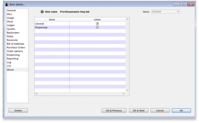 Selecting this item shows the stores where this item is visible, and allows these stores to be set to Active using the checkbox.