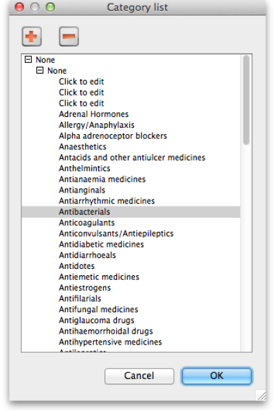 Selecting Show Item Categories from the Item menu opens the window appearing below, showing all the category 1 categories in their 3 levels by default (Note that the 3 “None” categories are default categories and cannot be renamed or removed): In the screenshot you can see that “6.Antiinfectives” is a top level (level 1) category 3 category. It has 3 level 2 child categories: “6.1 Antiinfectives, anthelmintics”, “6.2 Antiinfectives, antiamoebic/antigiardics” and “6.3 Antiinfectives, antibacterials”. And level 2 category “6.2 Antiinfectives, antiamoebic/antigiardics” has a single level 3 category “Antileprosy medicines”.