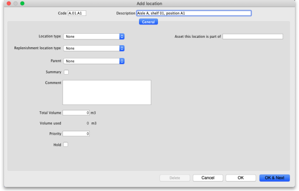 Locations in mSupply are the places you store stock. Locations can have types (e.g. normal, cold, bulk…) to help you categorise them or to make sure that items are put away in the right type of location (e.g. cold or secure storage, or a particular section of the warehouse).