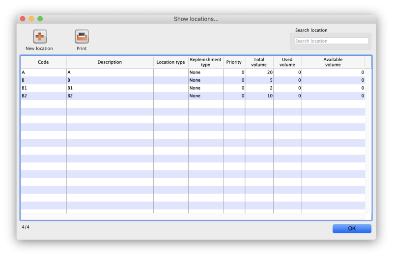 To view the locations you have defined choose Item > Show locations and you will see a list of location codes and descriptions: