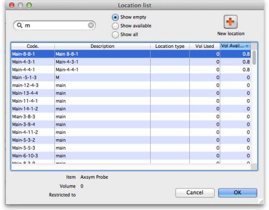 Whenever stock is being allocated to a location, mSupply allows the user to identify those locations that are either completely empty, or where there is volume available for the selected stock line: