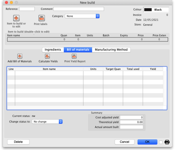 Note that ingredients can be added automatically from the Bill of materials tab. If you regularly build the same item, we recommend that you enter a Bill of Materials for the item being built, and use the method outlined under the Using a Bill of Materials heading below.