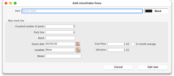 If a new line of stock was found which isn't in mSupply then add it using the New line button (see the Add a new line to a stocktake section below for details).