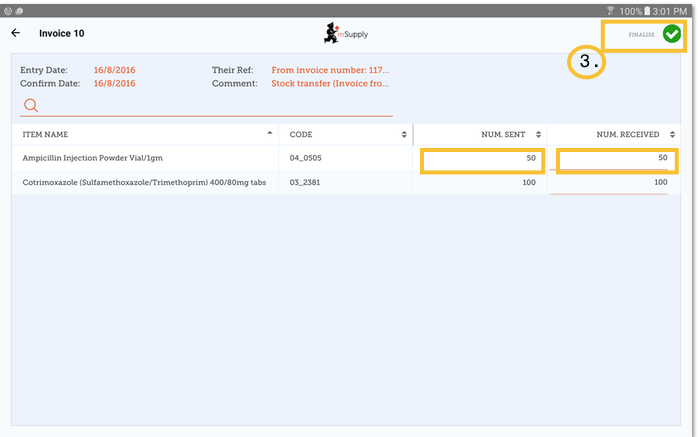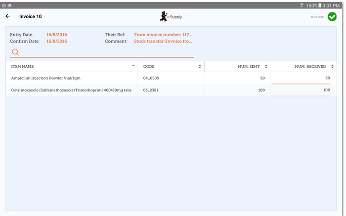 Also remember that the supplier invoice SHOULD match the stock you are receiving, but it may not. You must always check your order when it arrives. You can make changes to the Supplier Invoice on mSupply Mobile, or you can confirm everything is correct. When you are satisfied that the Supplier Invoice matches the stock you have received, you can 'Finalise' the order and accept it into your stock. Your 'Stock-On-Hand' numbers will automatically update!