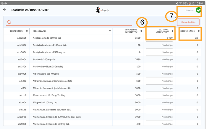 7. When you are finished, click 'Finalise'. This will update all your stock levels to match the quantities you have entered in the 'Actual Quantity' column.