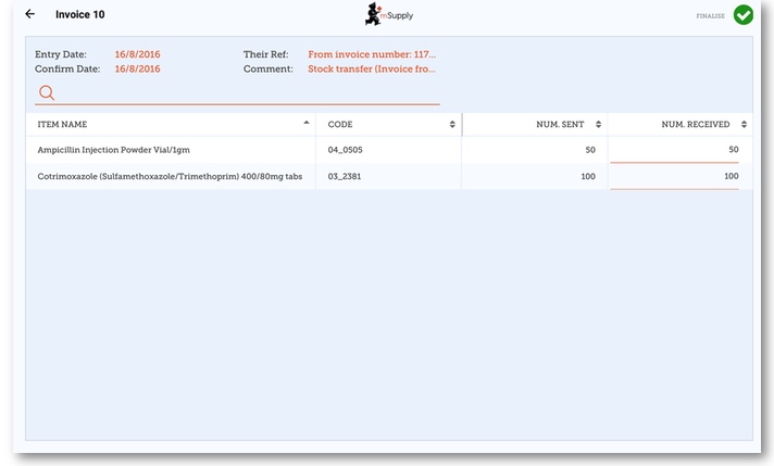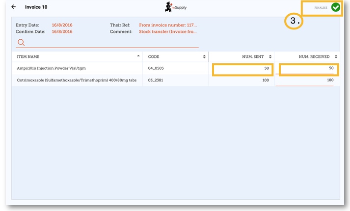 3. Once you are happy that the 'Number Received' column is correct, click 'Finalise', and then 'Confirm'.