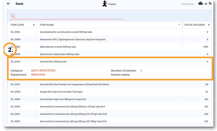 The 'Stock' section shows you a list of your current stock and allows you to do stocktakes. You can also use this area to search for an individual item (“how many paracetamol tablets do I have?”) or to update the stock levels for each item when you realise there is a mistake, or you are doing your regular stocktake.