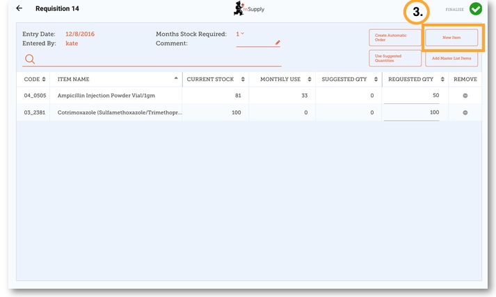 You would like to order some stock from your supplier (Medical Stores). You need to place an emergency order for Ampicillin injections and Co-Trimoxazole tablets.