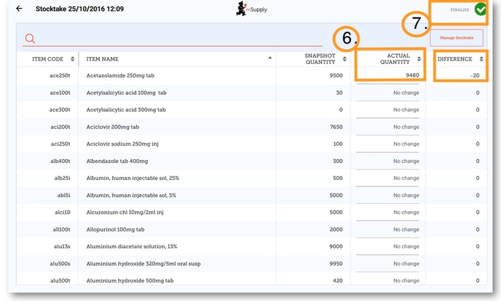 7. When you are finished, click 'Finalise'. This will update all your stock levels to match the quantities you have entered in the 'Actual Quantity' column.