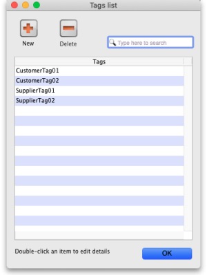To see a list of all the name tags currently set up choose Customer > Show tags… or Supplier > Show tags… from the menus. This window will open: